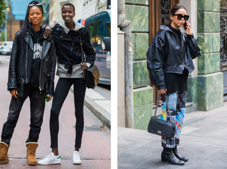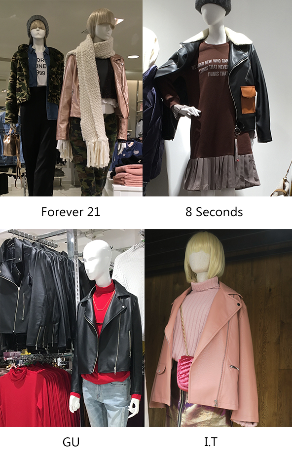 简约基础的PU机车夹克配以毛领、环扣、铆钉等细节设计,造型搭配主打休闲和干净,多数零售商选择将其与核心针织衫搭配在一起。