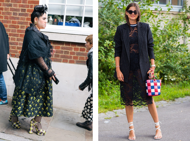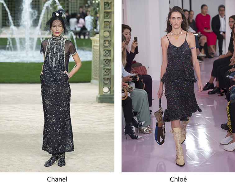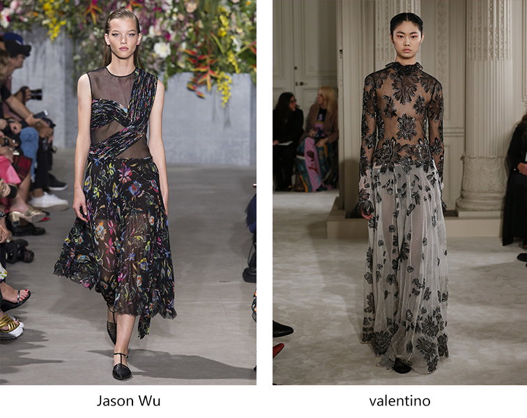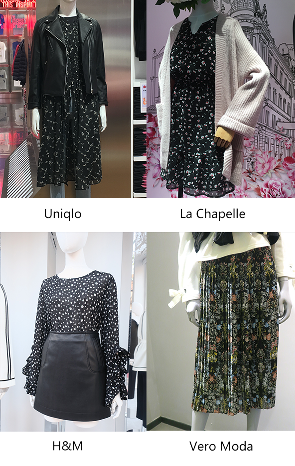与深暗底色形成鲜明对比的小尺寸花卉商业价值很高。Five Plus带来的蕾丝对比拼接款式将该印花的女性特质演绎到极致。对比造型,比如与骑手风和运动风上衣搭配能让整体造型看起来更时尚前卫;而与针织外套、毛衫搭配又是一种复古田园的风格。