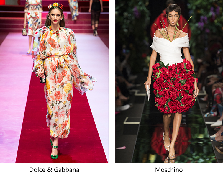 玫瑰图案在亚洲市场已经活跃了一段时间,作为女性的代表花卉,不管是玫瑰刺绣、玫瑰印花等形式的大片使用还是用作局部点缀装饰效果都能让整体服装变得春意盎然,生机勃勃;将女性的柔情浪漫演绎到极致。尤其突出的就是经常使用繁复图案,色彩对比度高的Dolce&Gabbana和GUCCI两大品牌。