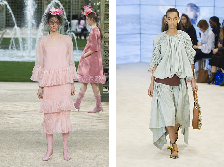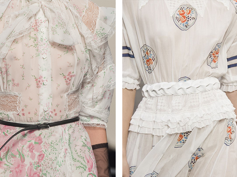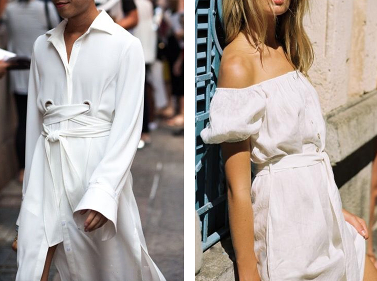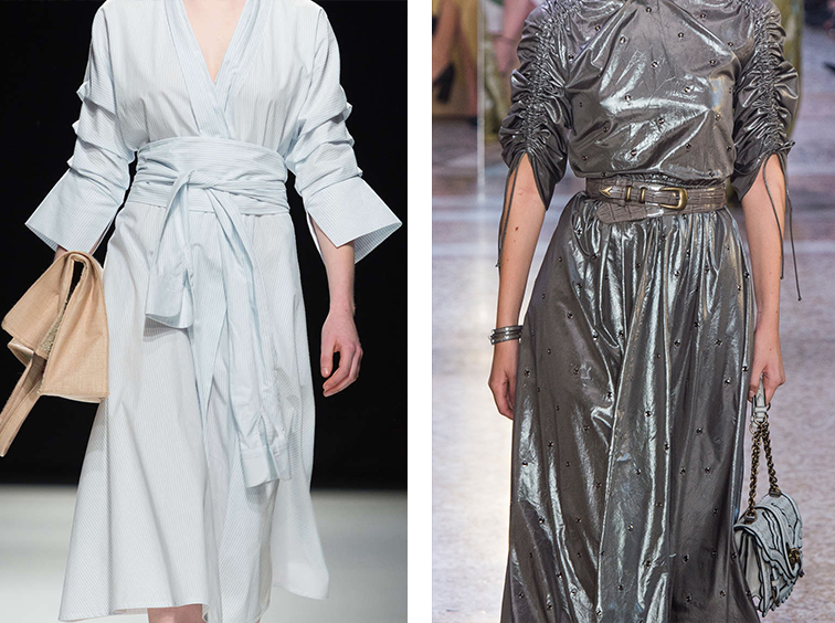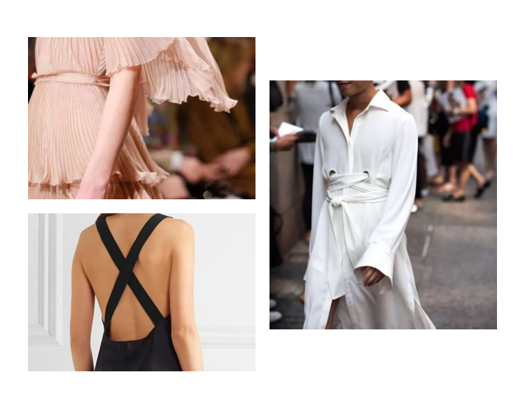 2018春夏,经过改良的经典棉质太阳裙重归时尚舞台。收腰是贯穿各式女装的重要细节。就连衣裙来说,腰部装饰是焦点,紧身胸衣式样、束带和简单的绑扎都是常见的腰部造型。