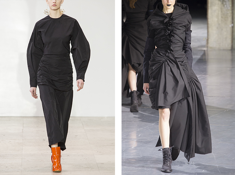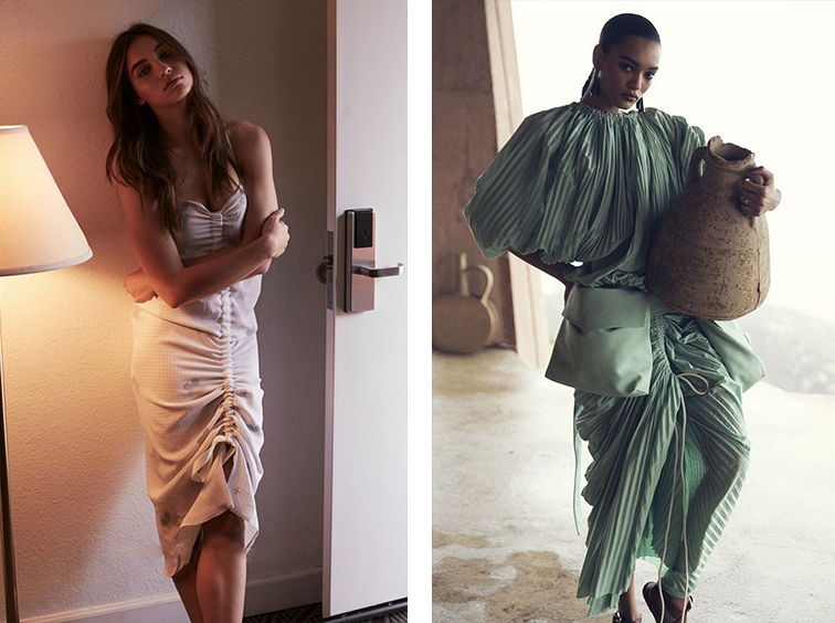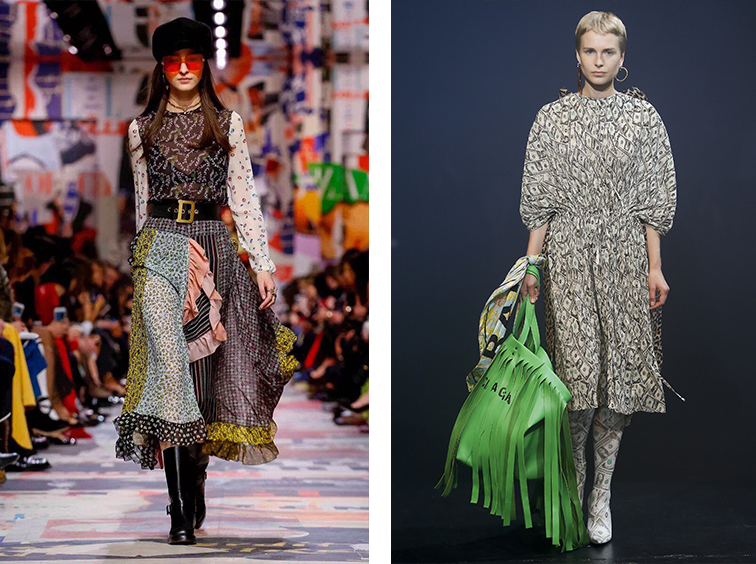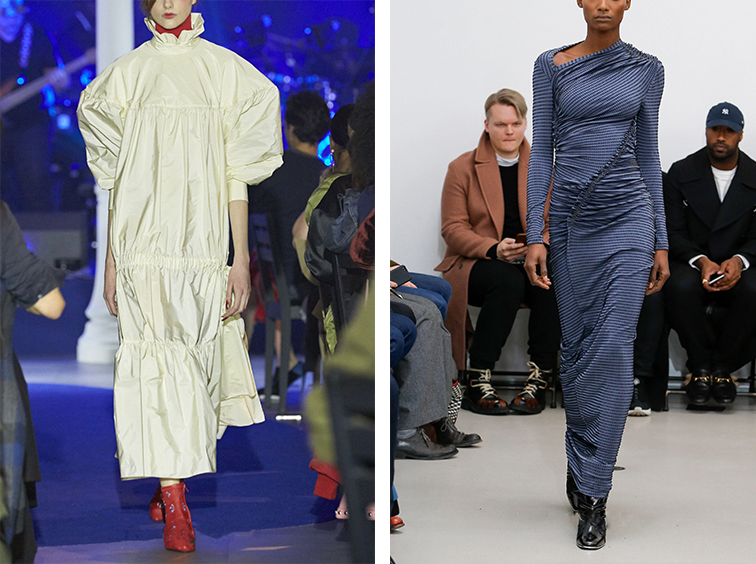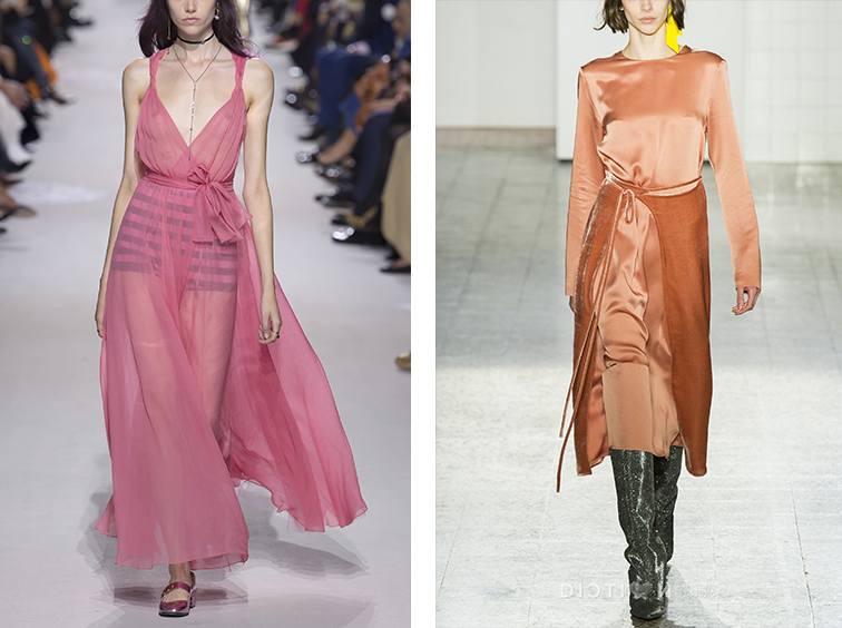 2018春夏,以荷叶边为灵感来源的褶饰在T台中大量涌现。不对称褶裥饰边搭配紧身版型,或点缀于侧线缝和衣袖上,让衣品更独特。平纹针织面料呈现动感柔美的风格,高档梭织面料更显精致时尚。80年代风格的垂坠、缠裹和褶裥细节能够突出曼妙的轮廓。