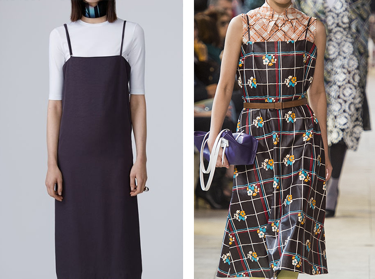 去年流行的吊带连衣裙在2018春夏经过调整后以方领直筒设计呈现。线条分明的方形领口搭配纤细肩带,打造极简风格。该版型一般将口袋隐藏在侧线缝内或不设口袋。其中方领连衣裙在Dior18春夏发布的新品中也占据着较大比重。