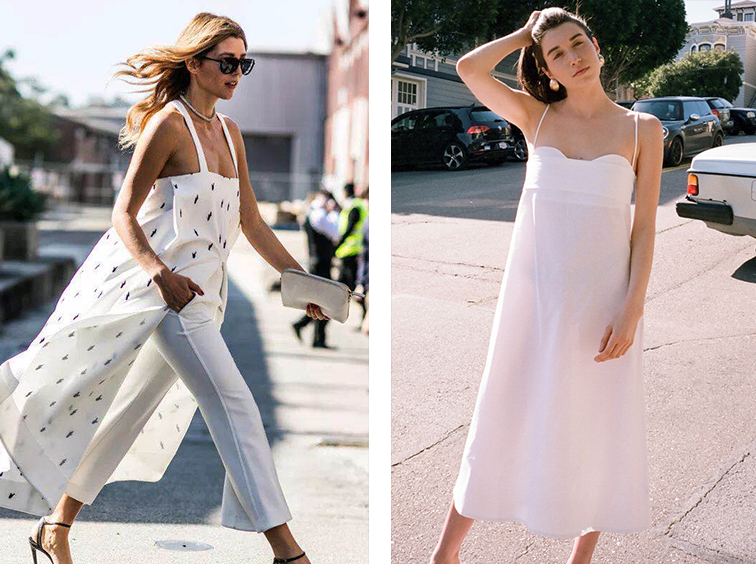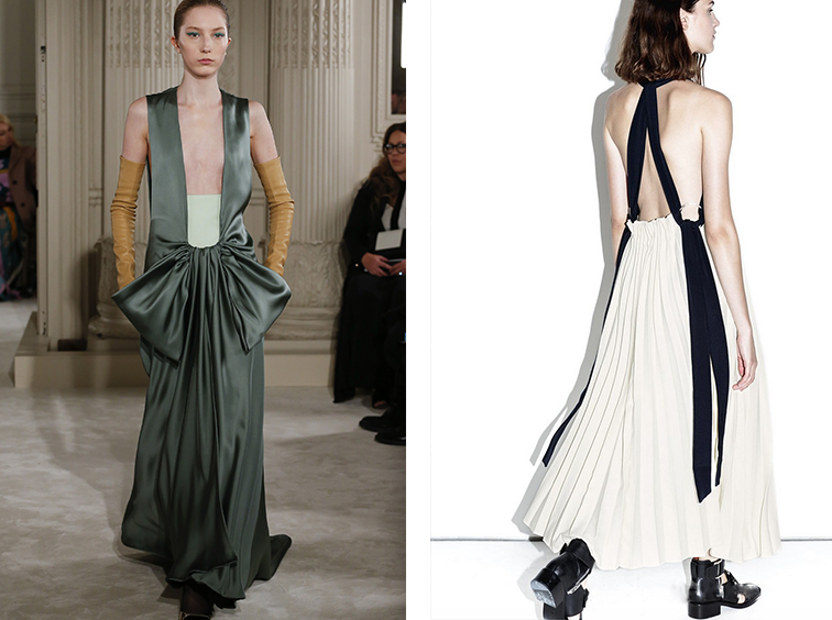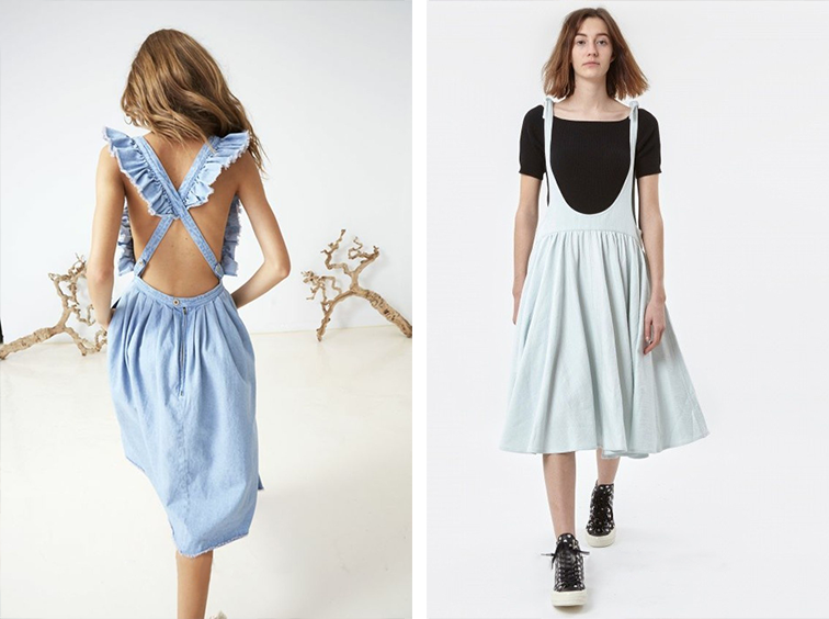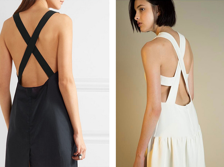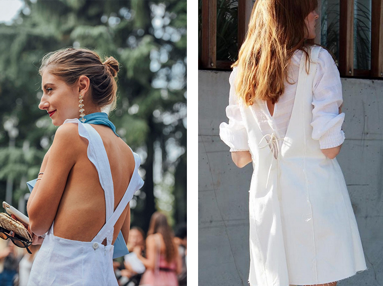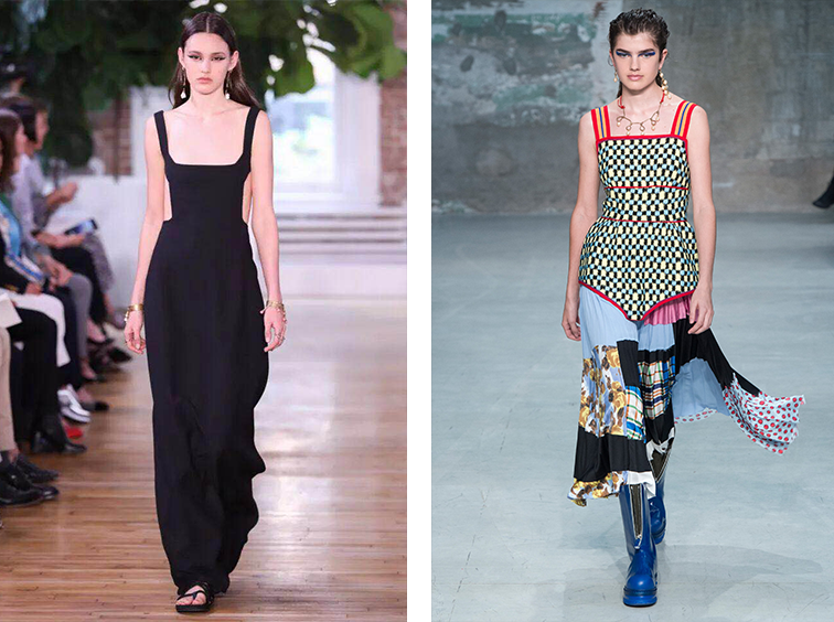 后背设计是围裙式连衣裙的关键,细节包括柔软的褶边、可爱的纽扣、系带扣件和传统的交叉背带等。这些细节与迷你裙、中长裙和拖地长裙的结合打造新颖的春夏季造型。