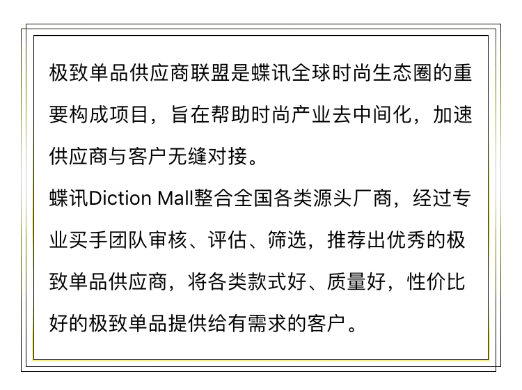 当前位置:Diction Mall >>资讯中心 >>上蝶讯DictionMall找极致单品供应商————18春夏女装快反产品看货会