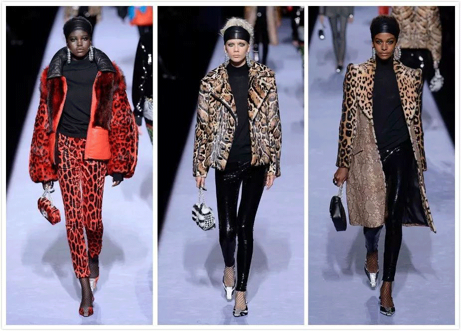 如今动物纹服装再度风靡,和以往流行时又有些不同。最具代表性的Tom Ford 2018秋冬系列动物纹以许多不同的材质和颜色进行呈现,显得更加有层次。轻薄材质的豹纹和斑马纹Legging被用来中和厚重的大衣,各种动物纹拼接的皮草外套又比单一动物纹看起来更个性鲜明,除此之外动物纹还分别以西装套装和纱裙的造型亮相,基本上从全方位展示了动物纹的最新使用方法。
